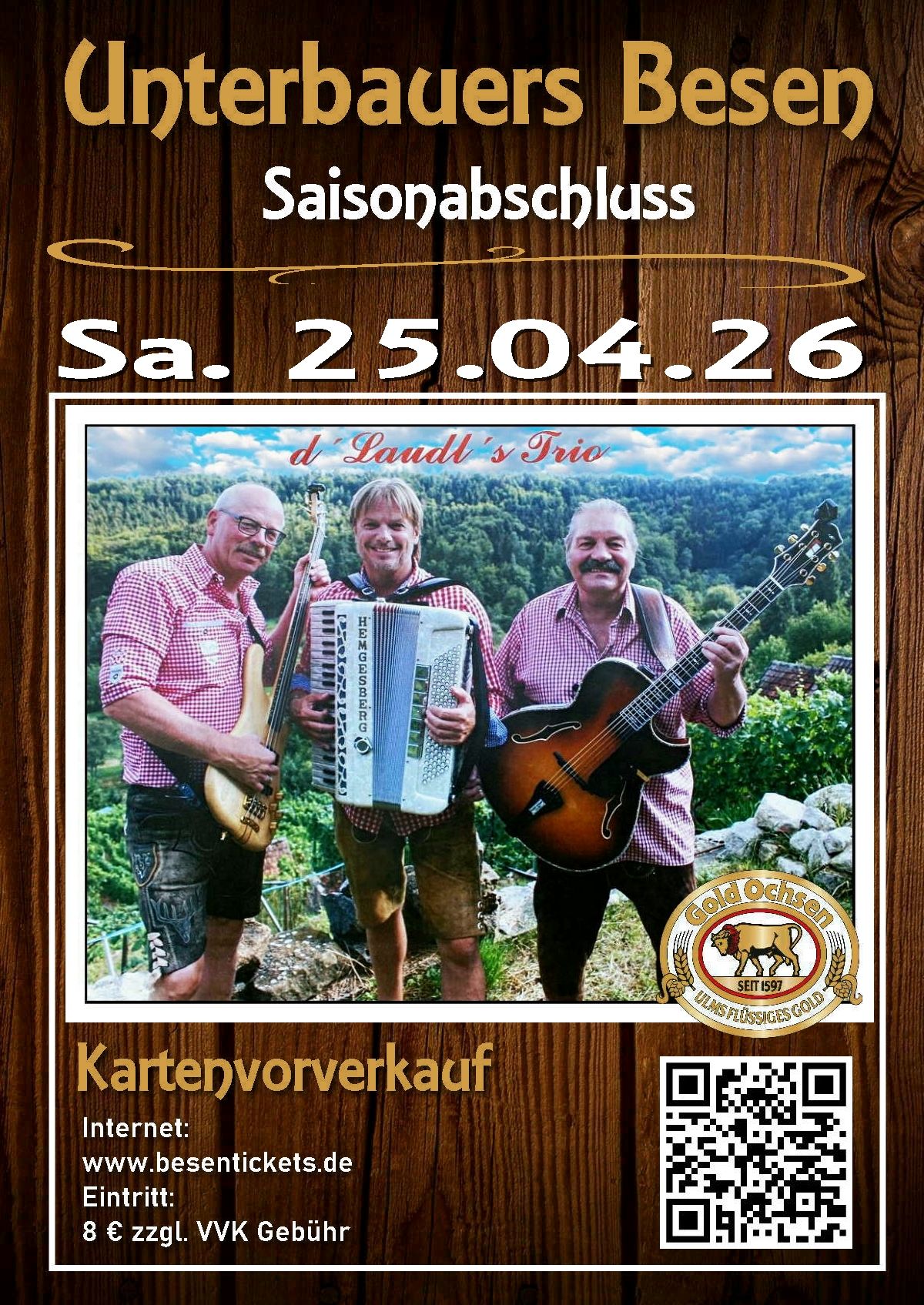 Compre boletos en línea. Venta anticipada del 20.01.2026 al 23.04.2026 Entradas para d´Laudl´s Trio | Saisonabschluss |Stimmungsabend im BesenUnterbauer´s Besen in 73312 WaldhausenAdmisión a las 16:00 horas